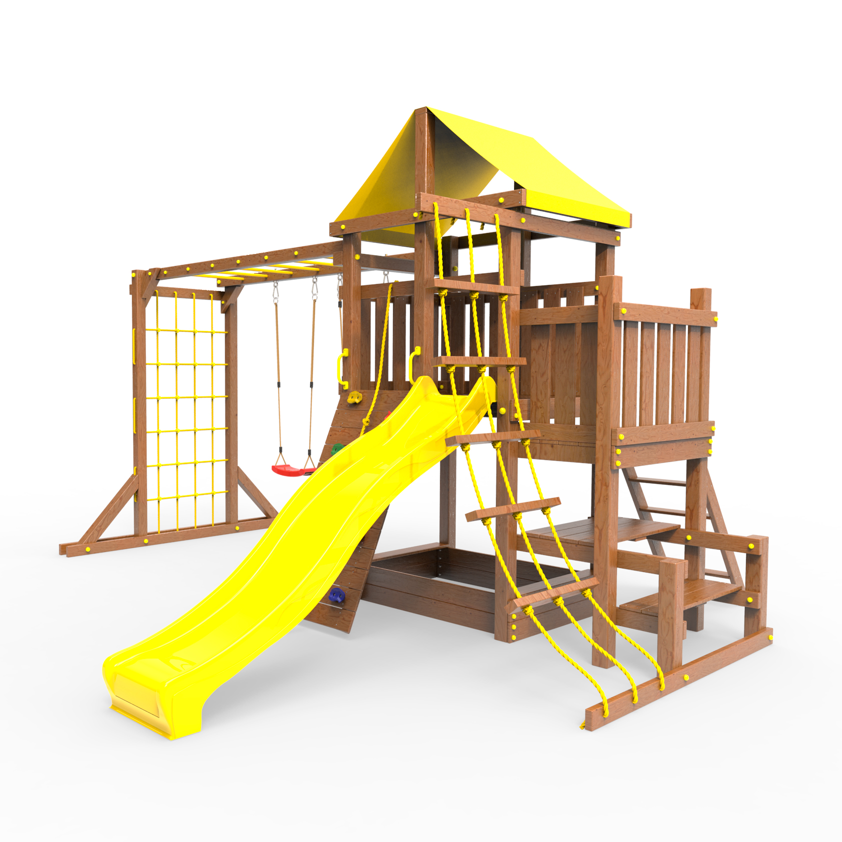 | Комплектация | Домик|Песочница|Лестница|Шторм-трап|Скалодром|Балкон|Столик с лавочками|Горка|Качели|Рукоход|Руфер|Сеть для лазания |