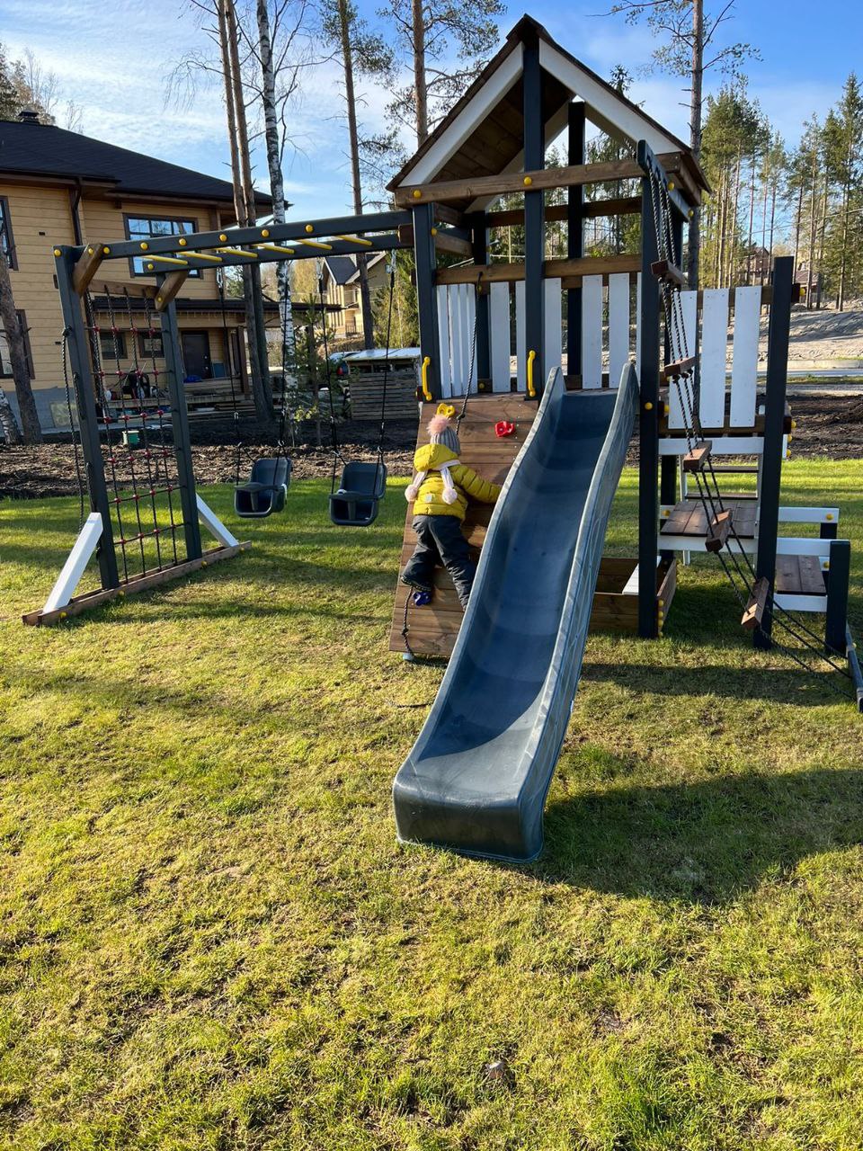 Обращаем Ваше внимание, что фактический цвет детской площадки может отличаться от представленных фото на сайте. Специфика окраски нетоксичными пропитками и красителями допускает отклонения в цветовой гамме отгружаемых изделий. Также обратите внимание, что фактический цвет может отличаться из-за цветопередачи устройства на котором Вы смотрите фото. Производитель оставляет за собой право менять цвет отдельных деталей и комплектующих(включая пластик, канаты и пр.), при этом сохраняя весь функционал и характеристики товара.